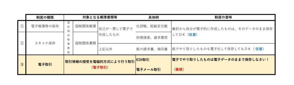 ①と②についてはどちらも任意規定なので、今まで通り紙面のものを保存するでも良し、事務所の省スペース化のためにデータ化して保存するも良し、という規定です。